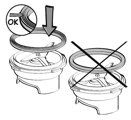 • Check that the gasket/seal is positioned the correct way around on the blade unit - the 3 folds of the gasket/seal must be visible once it is in place. If it is positioned in the other direction, you will not be able to lock the blade unit on the jug.
